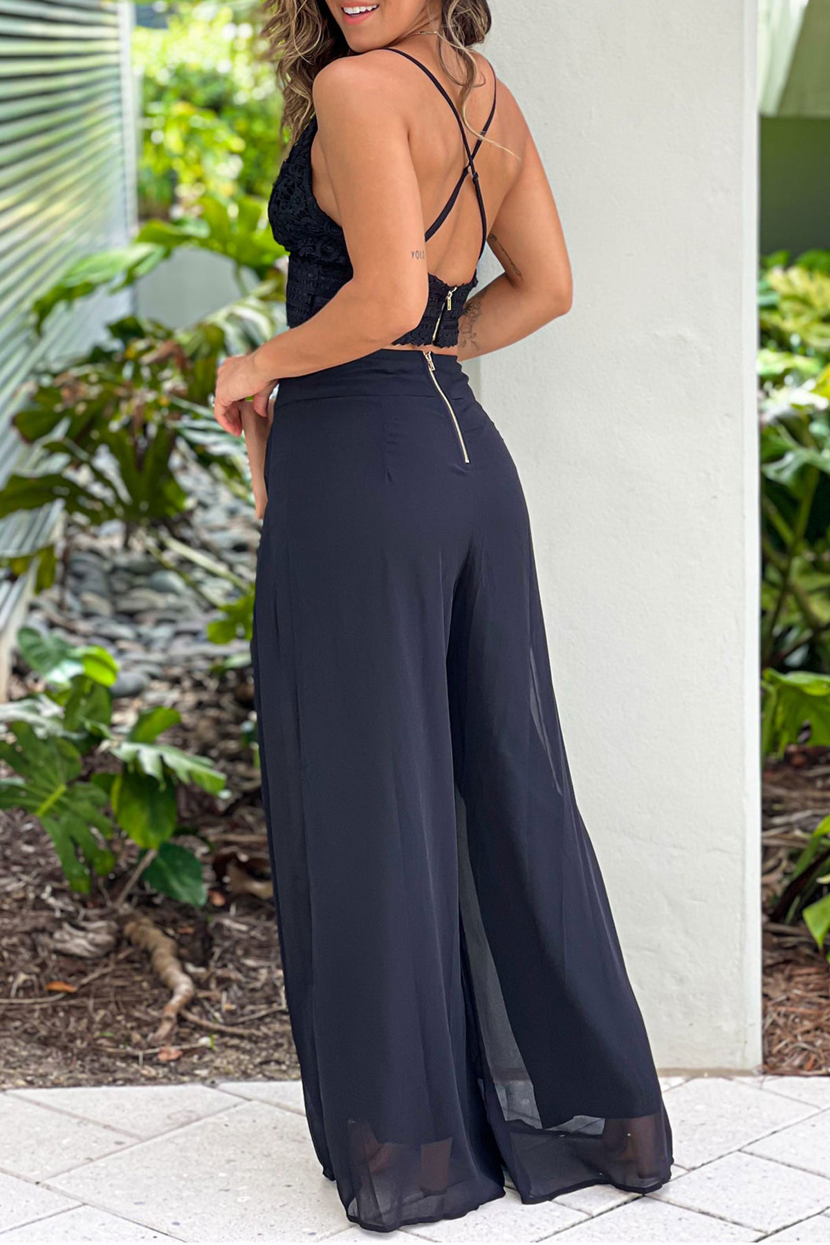 OMG, check out this awesome Black Crochet Criss Cross Top And Palazzo Pants Set that is a must have addition to any woman's wardrobe! This pretty set features a beautiful crochet top with criss cross back and comfy palazzo pants!