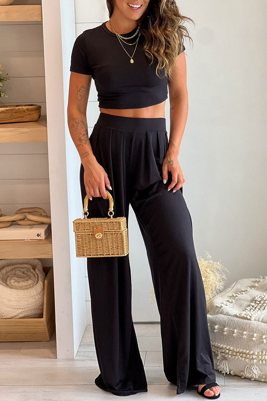WOW, check out this most cute and comfy Black Crop Top And Pants Set! We absolutely love this casual two piece set that has a great chance to become your go to outfit this summer season!