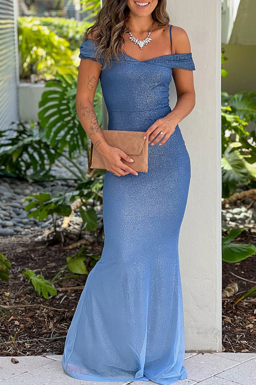 This Light Blue Ombre Glitter Off Shoulder Maxi Dress is so gorgeous! The glitter detailing is stunning and we love the ombre gradient transition that makes the dress look even more beautiful and chic. This is a perfect formal maxi dress for any special occasion!