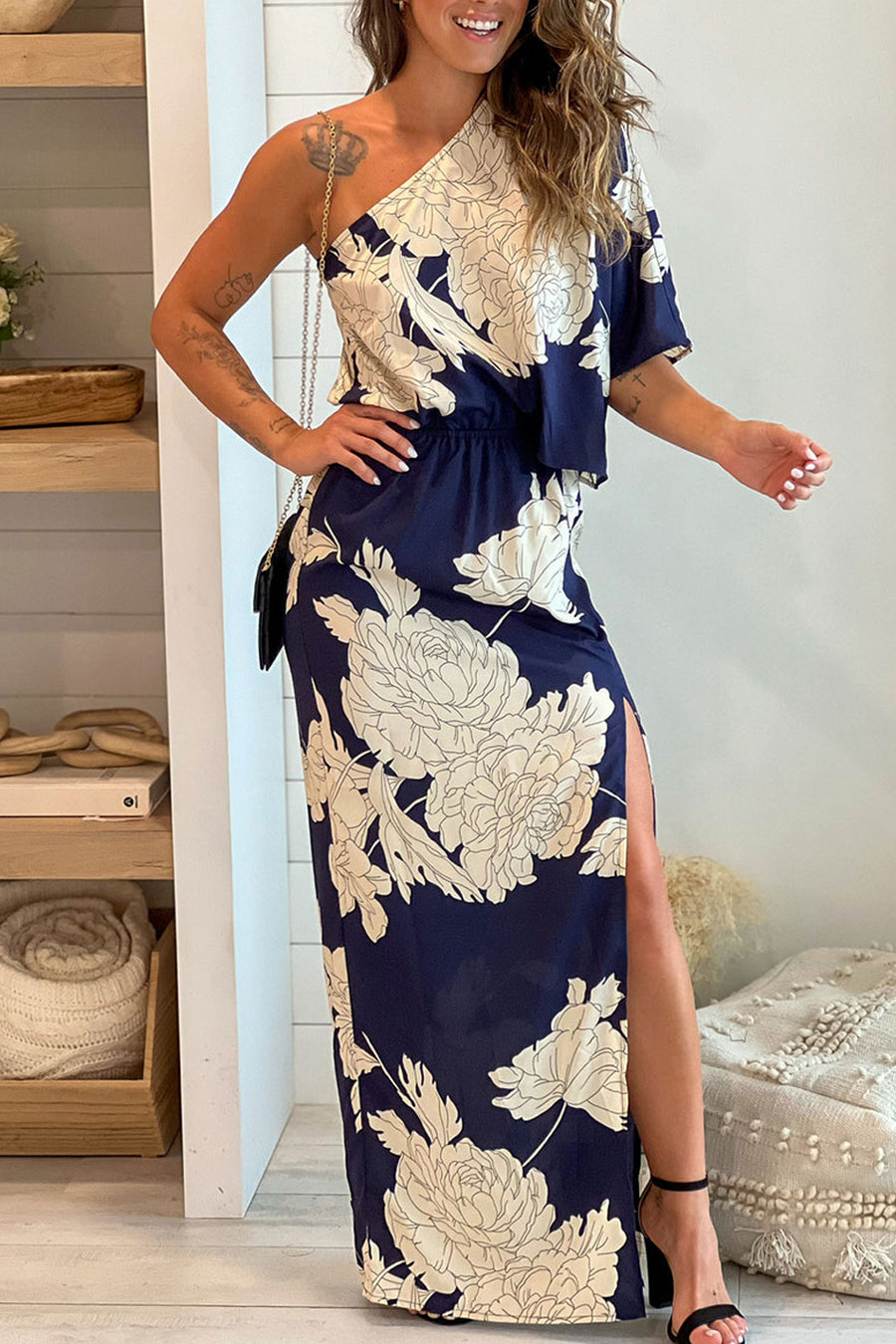We are completely in love with this beautiful Navy And White One Shoulder Maxi Dress With Slit that is now available. Check out its gorgeous floral print and the elegant one shoulder style! Perfect for this Spring/Summer seasons!